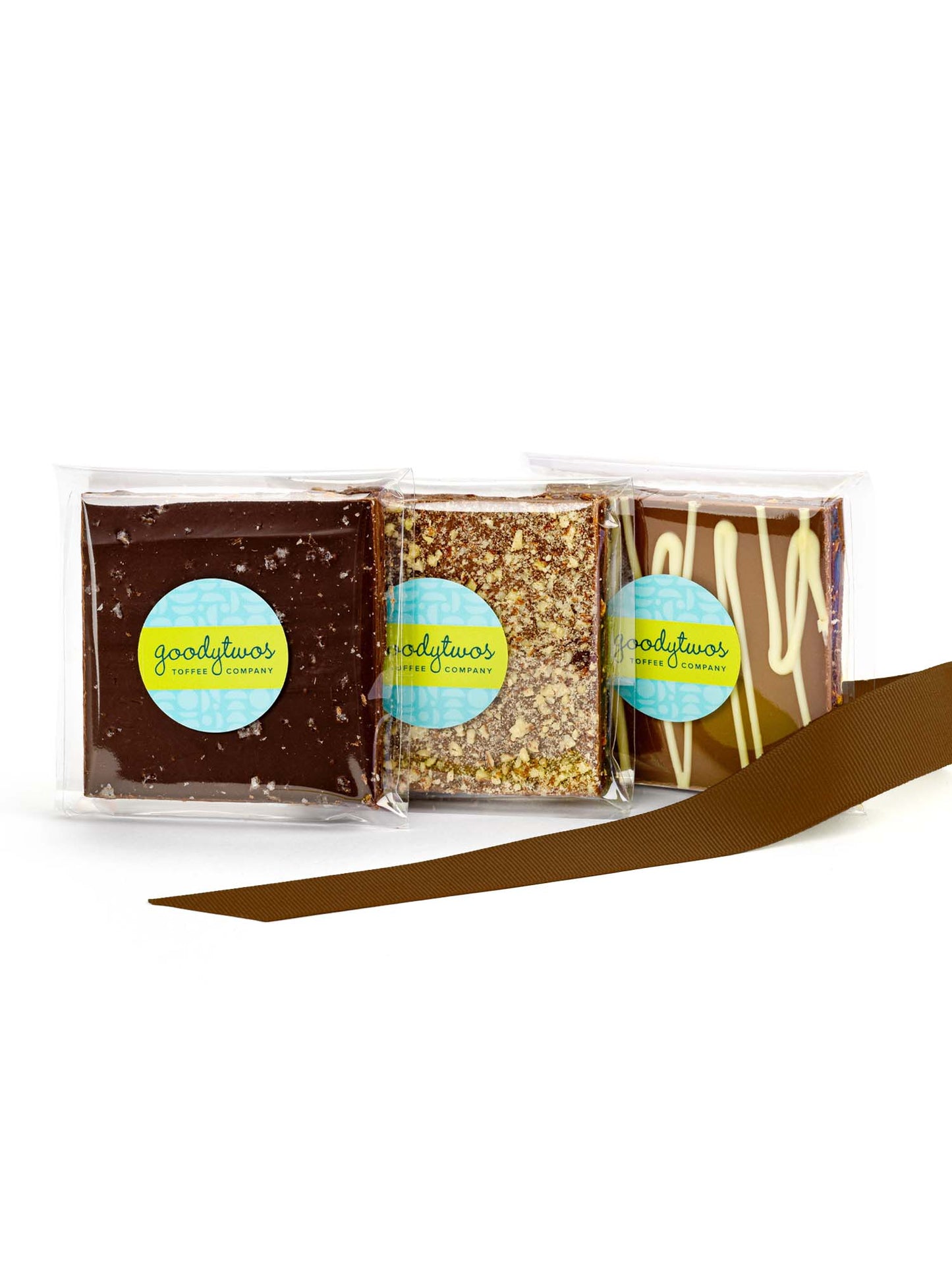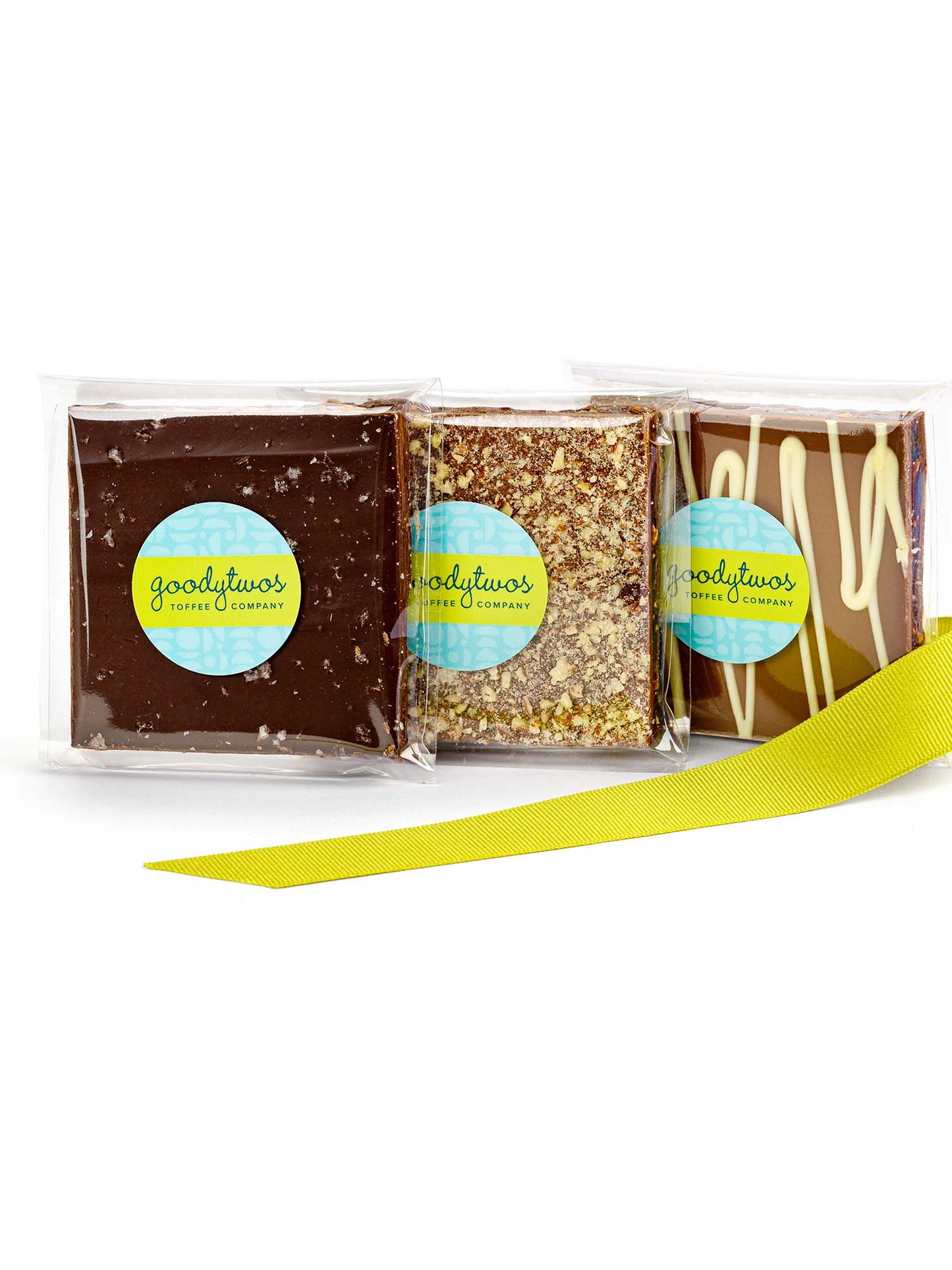 Goodytwos Duo Double Crossed and Sweet & Salty toffee with green ribbon, goodytwos.com