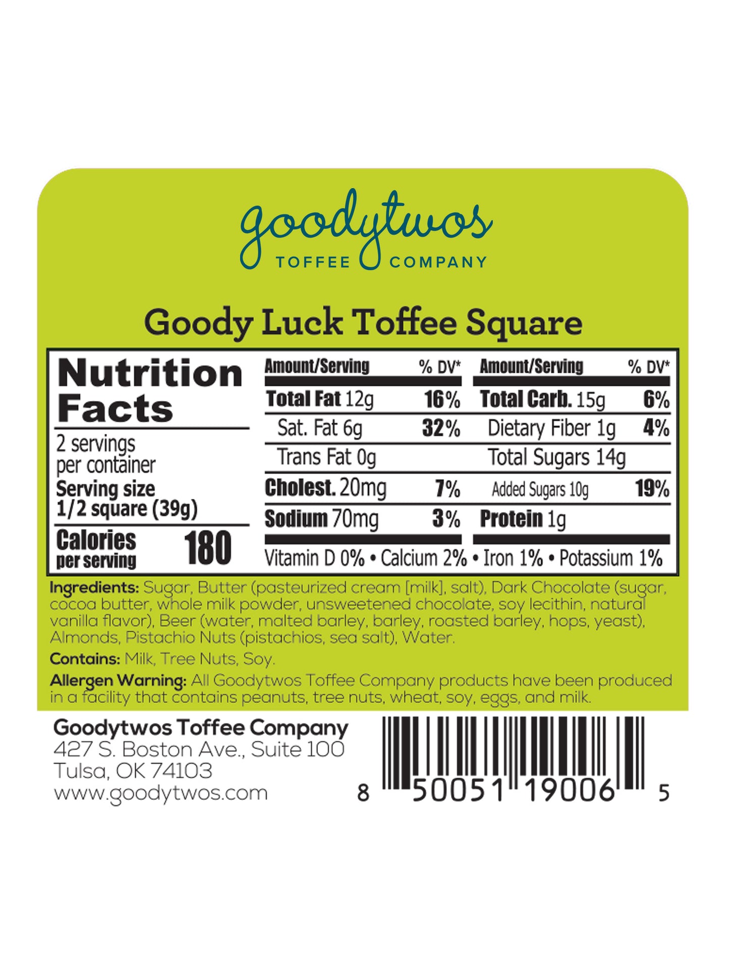 With this deliciously dark toffee, you too can experience the "Goody Luck" of the Irish! Fresh almonds, sweet sugar, creamery butter, and Guinness stout are all coated with pure dark chocolate and pistachios. Are you feeling lucky?