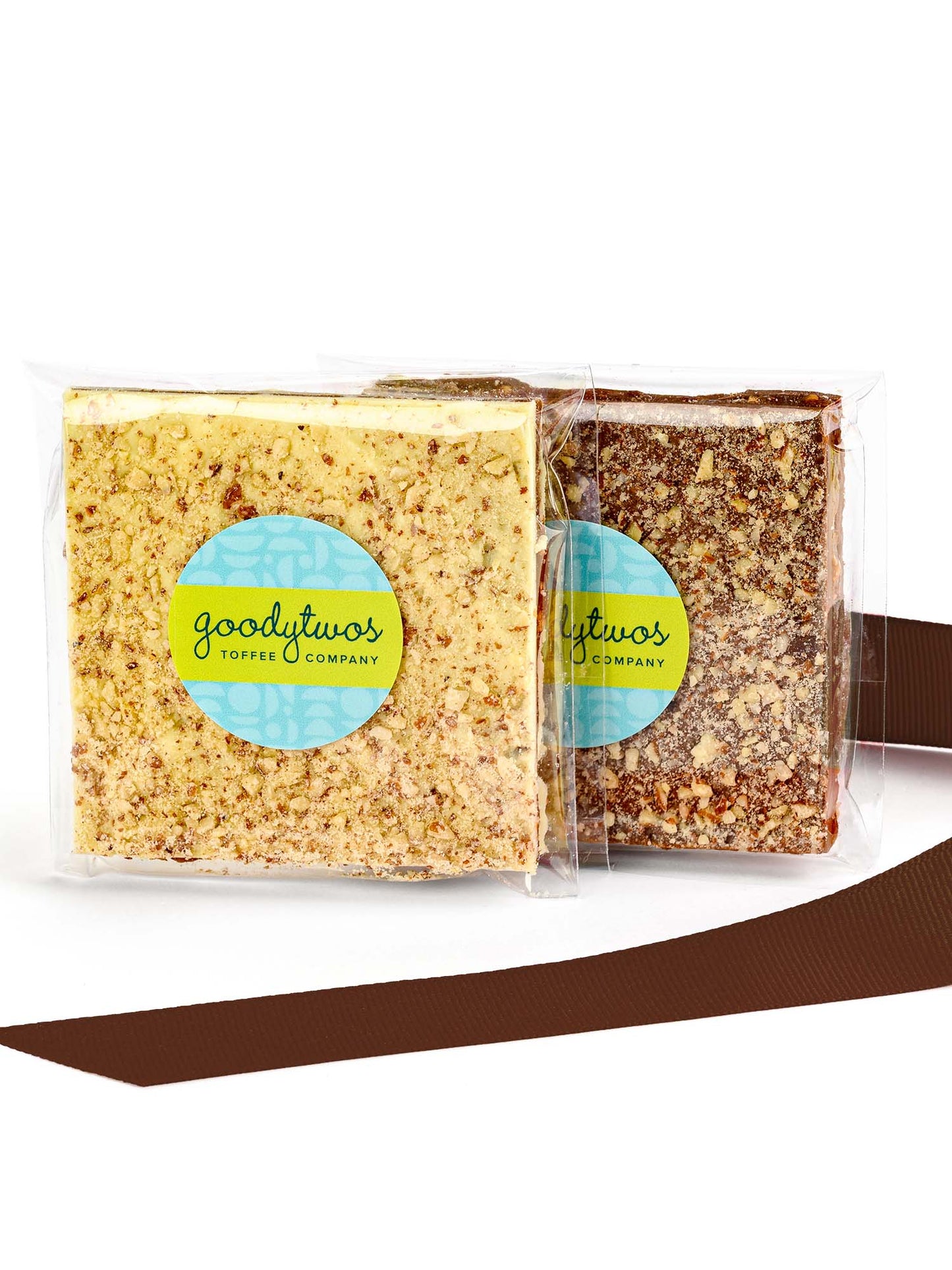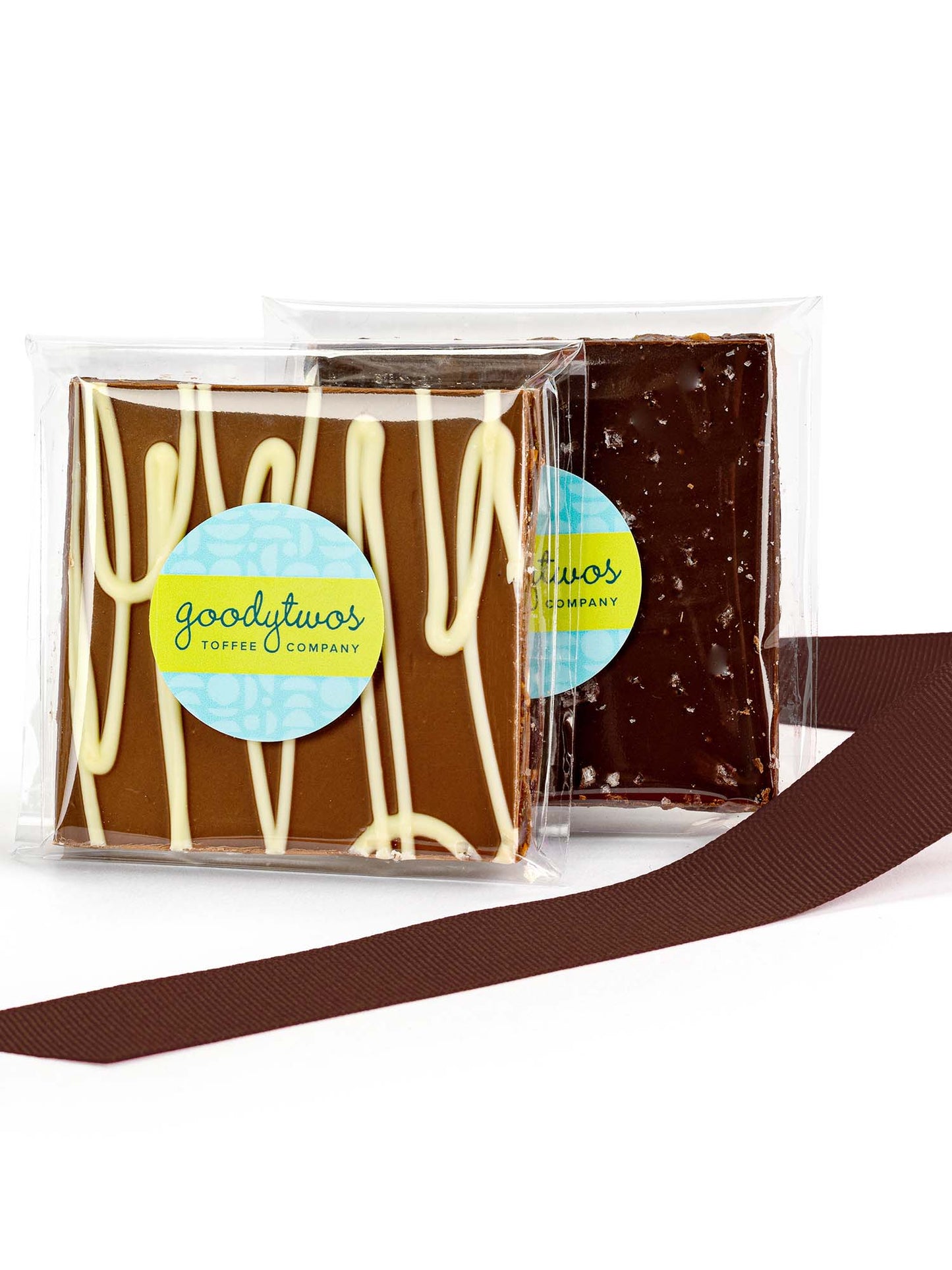 Goodytwos Duo Double Crossed and Sweet & Salty toffee with brown ribbon, goodytwos.com