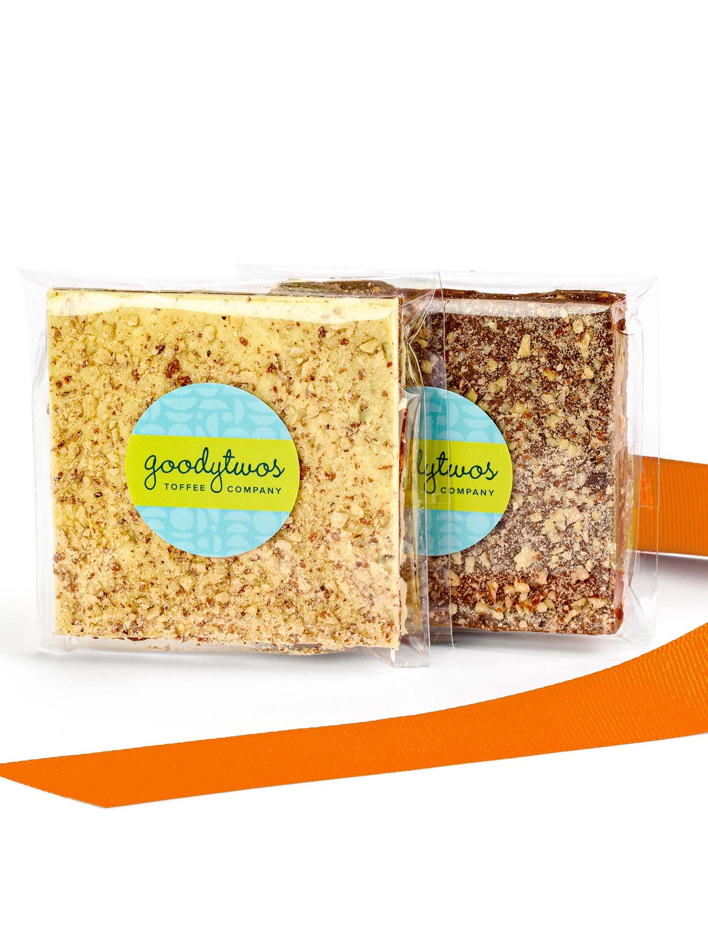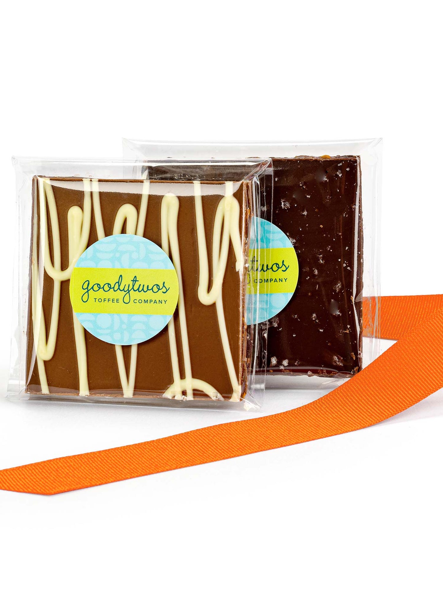 Goodytwos Duo Double Crossed and Sweet & Salty toffee with orange ribbon, goodytwos.com