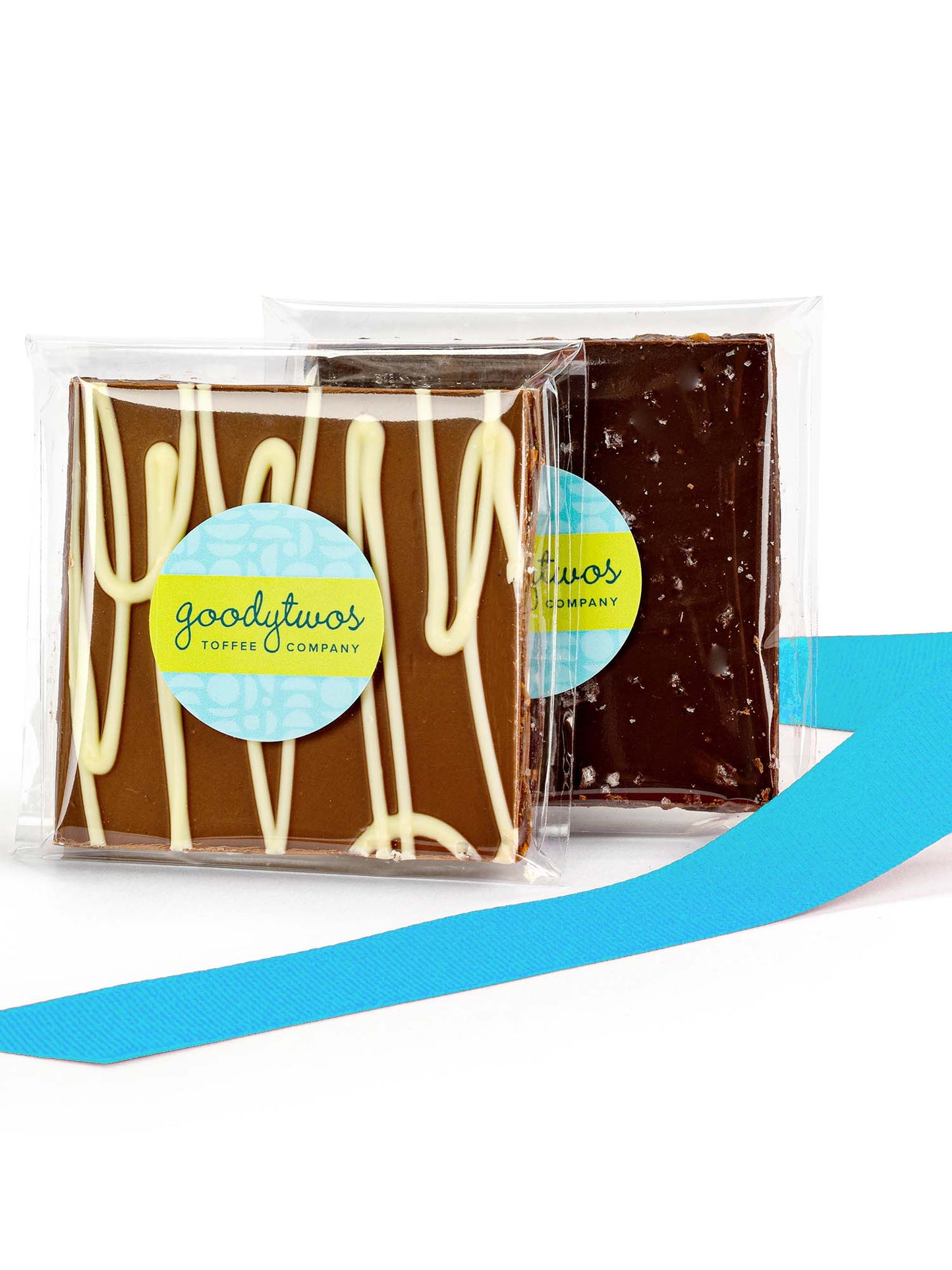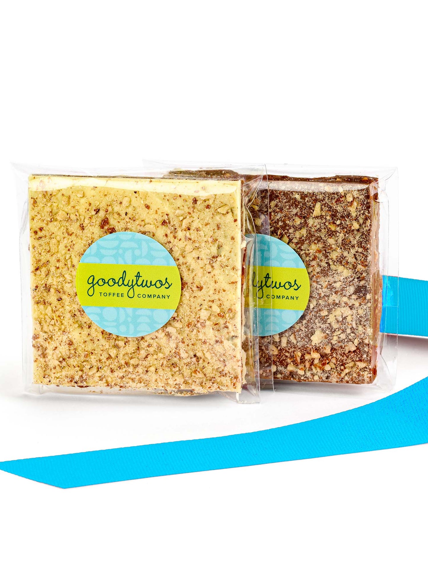 Goodytwos Duo Double Crossed and Sweet & Salty toffee with turquoise ribbon, goodytwos.com