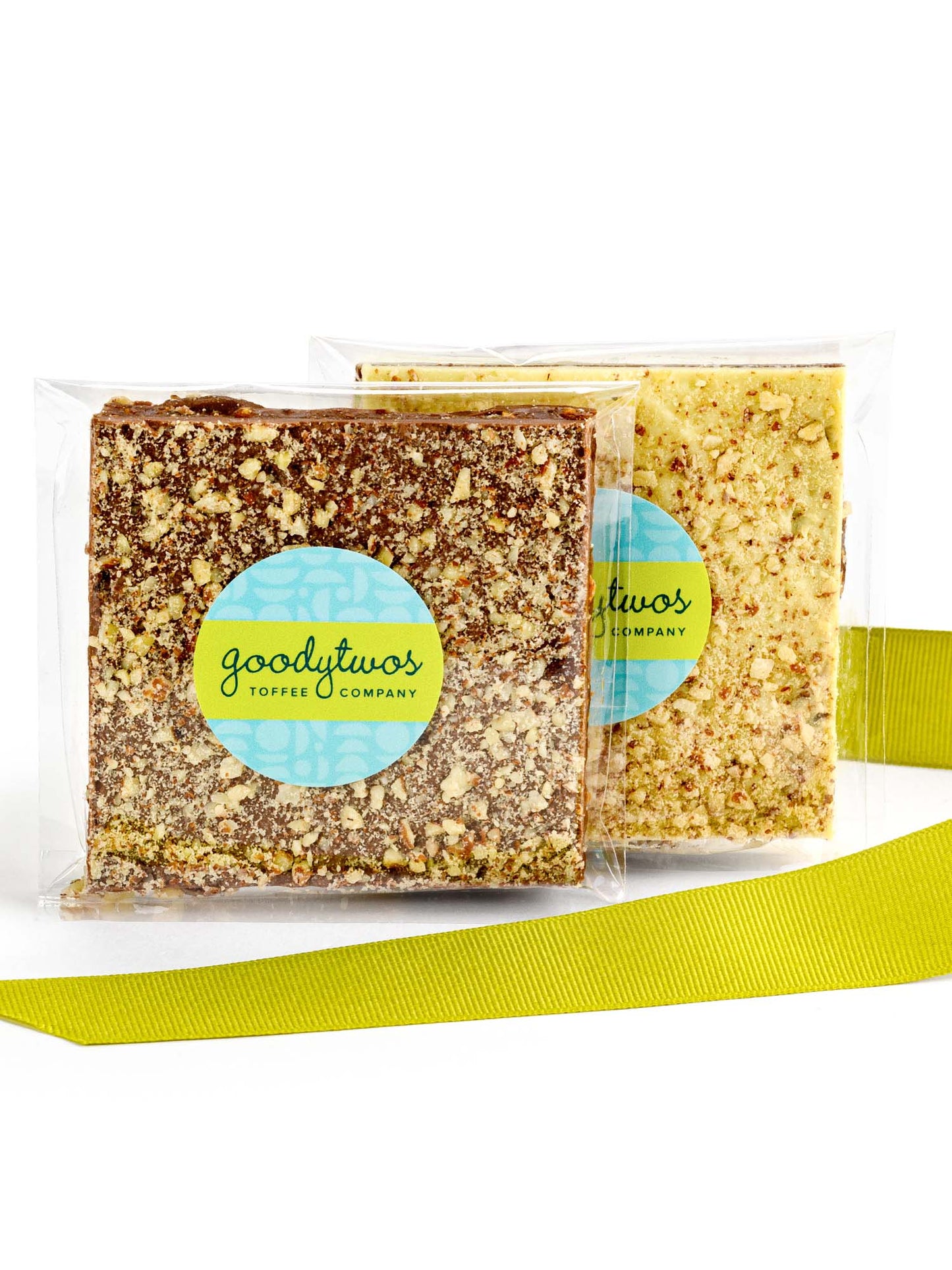 Goodytwos Duo Double Crossed and Sweet & Salty toffee with green ribbon, goodytwos.com