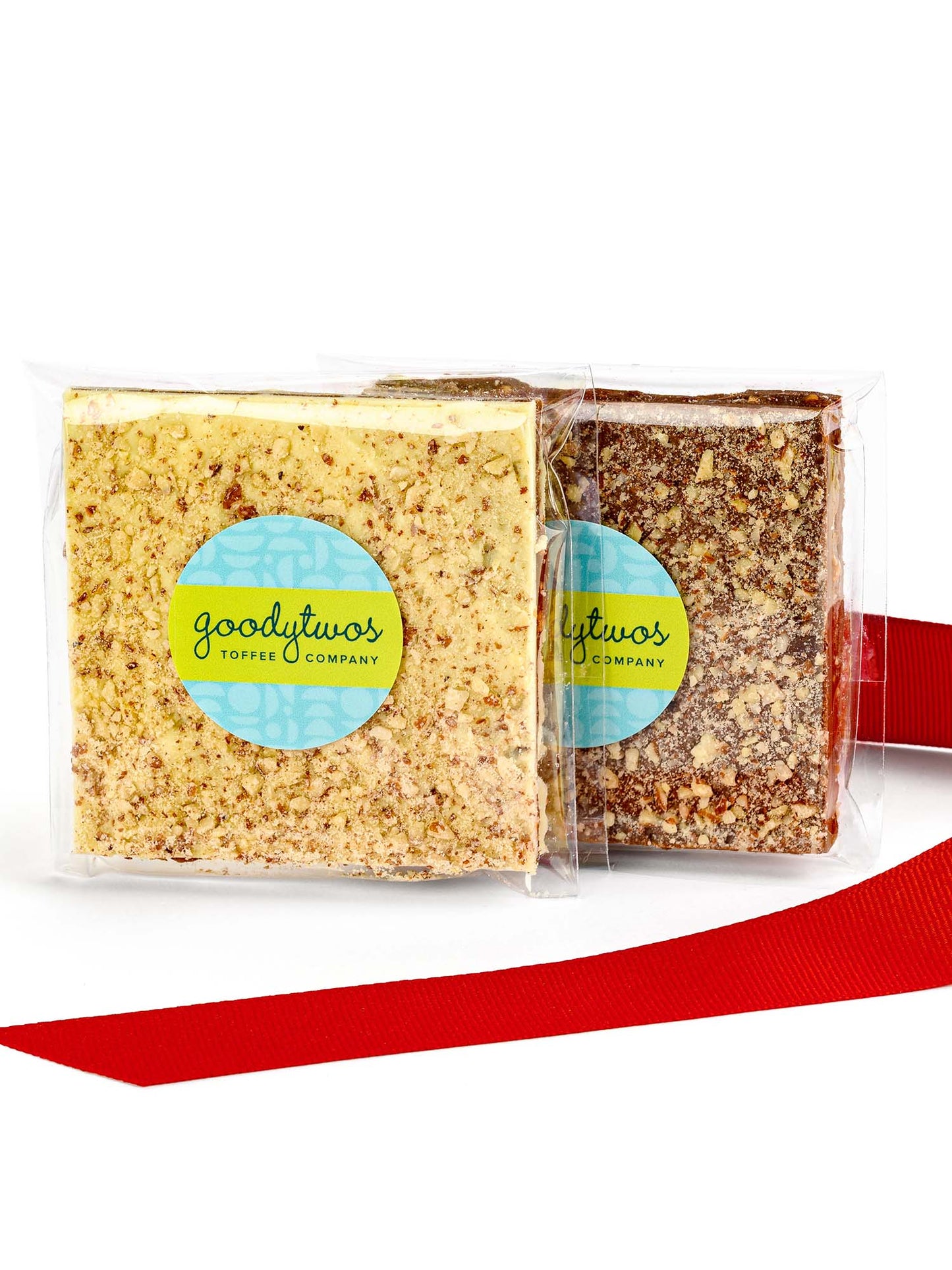Goodytwos Duo Double Crossed and Sweet & Salty toffee with red ribbon, goodytwos.com