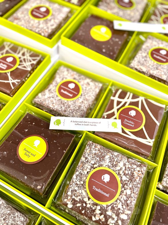 Wrapped to perfection. Easy as 1,2...yum! Goody boxes contain individually wrapped Toffee squares (approx. 3"x 3"). Pick from our 8-piece, 12-piece, or 16-piece goody gift box. For a larger gift option, choose from our 24-piece goody gift stack or 32-piece goody gift tower. Each goody gift box is complete with handcrafted Traditional, White Chocolate Traditional, Double Crossed, and Sweet & Salty toffee squares. Sweetly sealed with your choice of our signature goody green ribbon, festive red ribbon or rich chocolate brown ribbon.