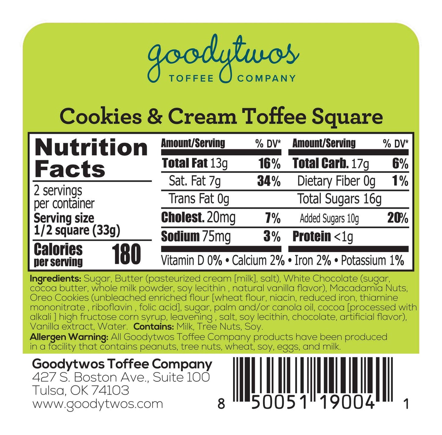 The ultimate dessert combo is now in a toffee square! Fresh creamery butter, pure cane sugar, and decadent macadamia nuts coated in luxurious white chocolate, then topped with your favorite cream-filled cookie... say no more. I'll take 10!