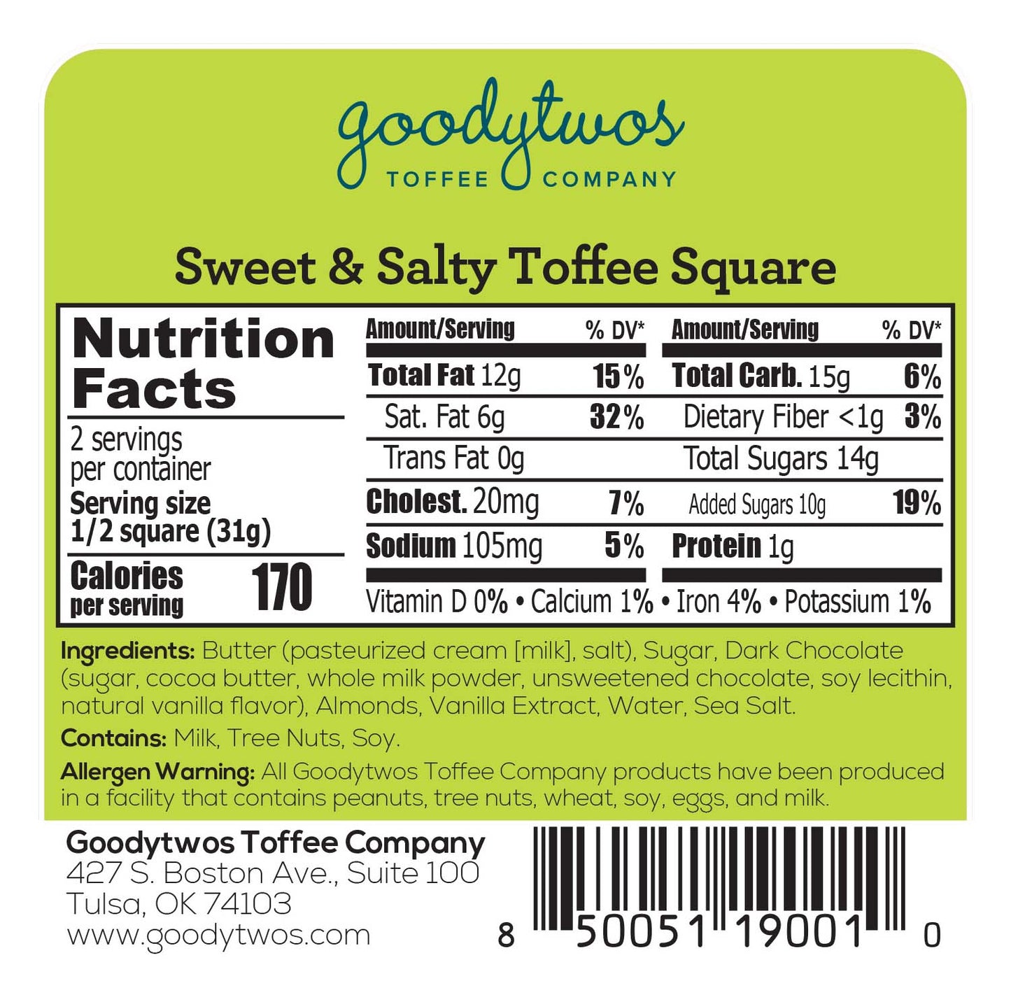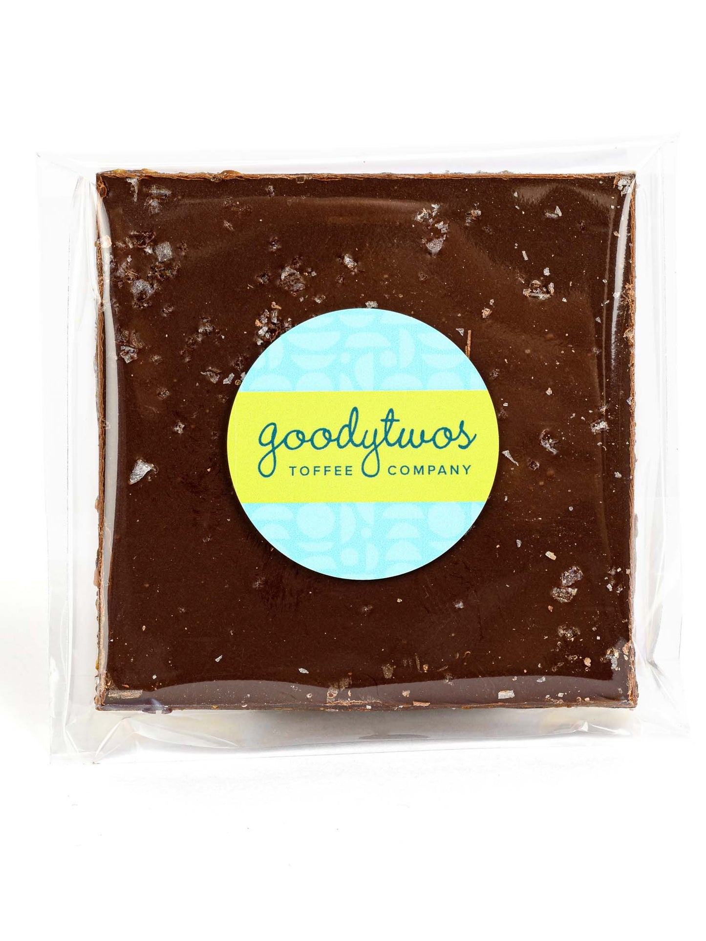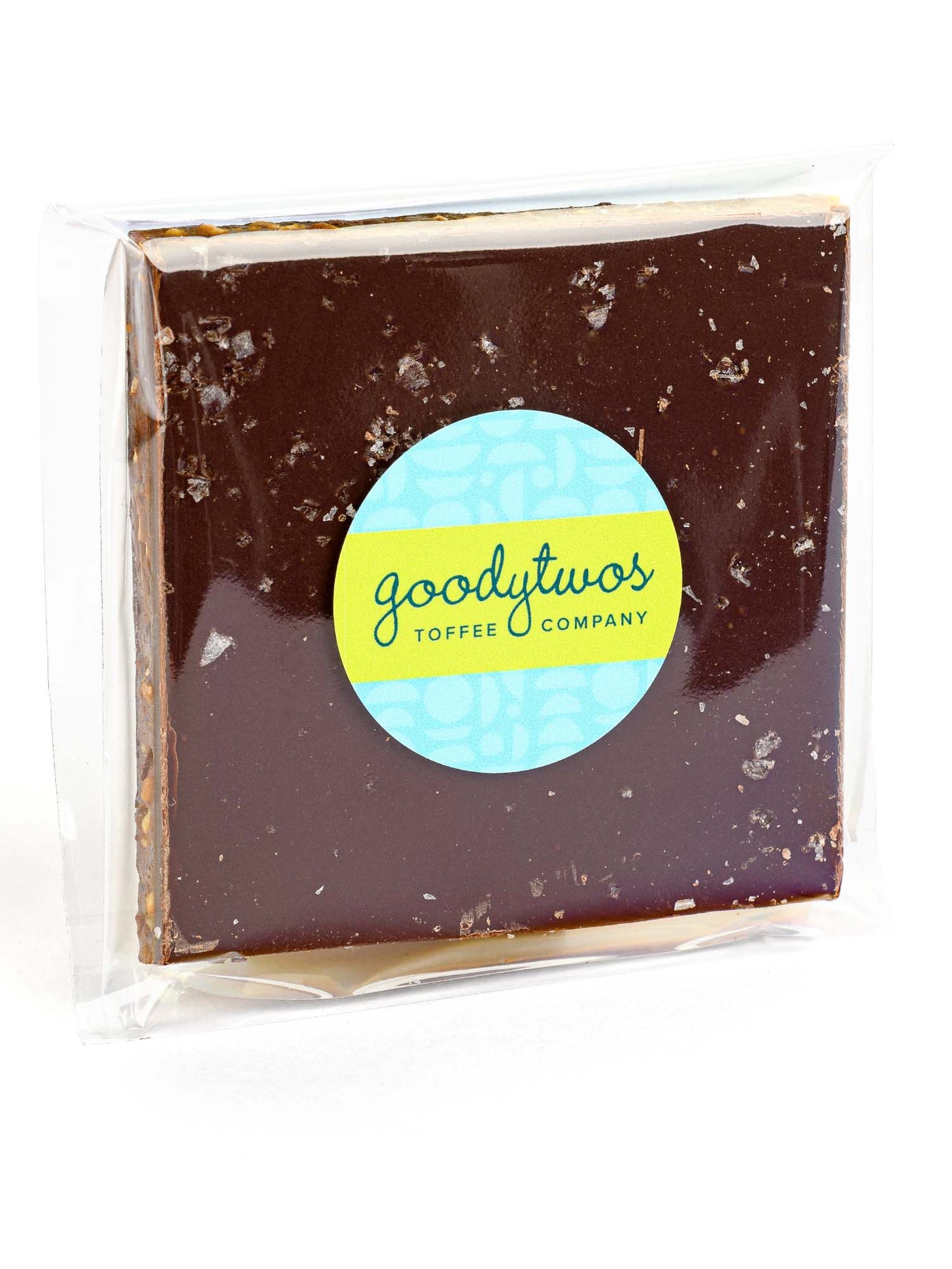 The Sweet & Salty Toffee Squares are made with sweet fresh almonds, Madagascar Bourbon vanilla, and 72% dark Belgian cacao chocolate, all smooched with French coarse sea salt..