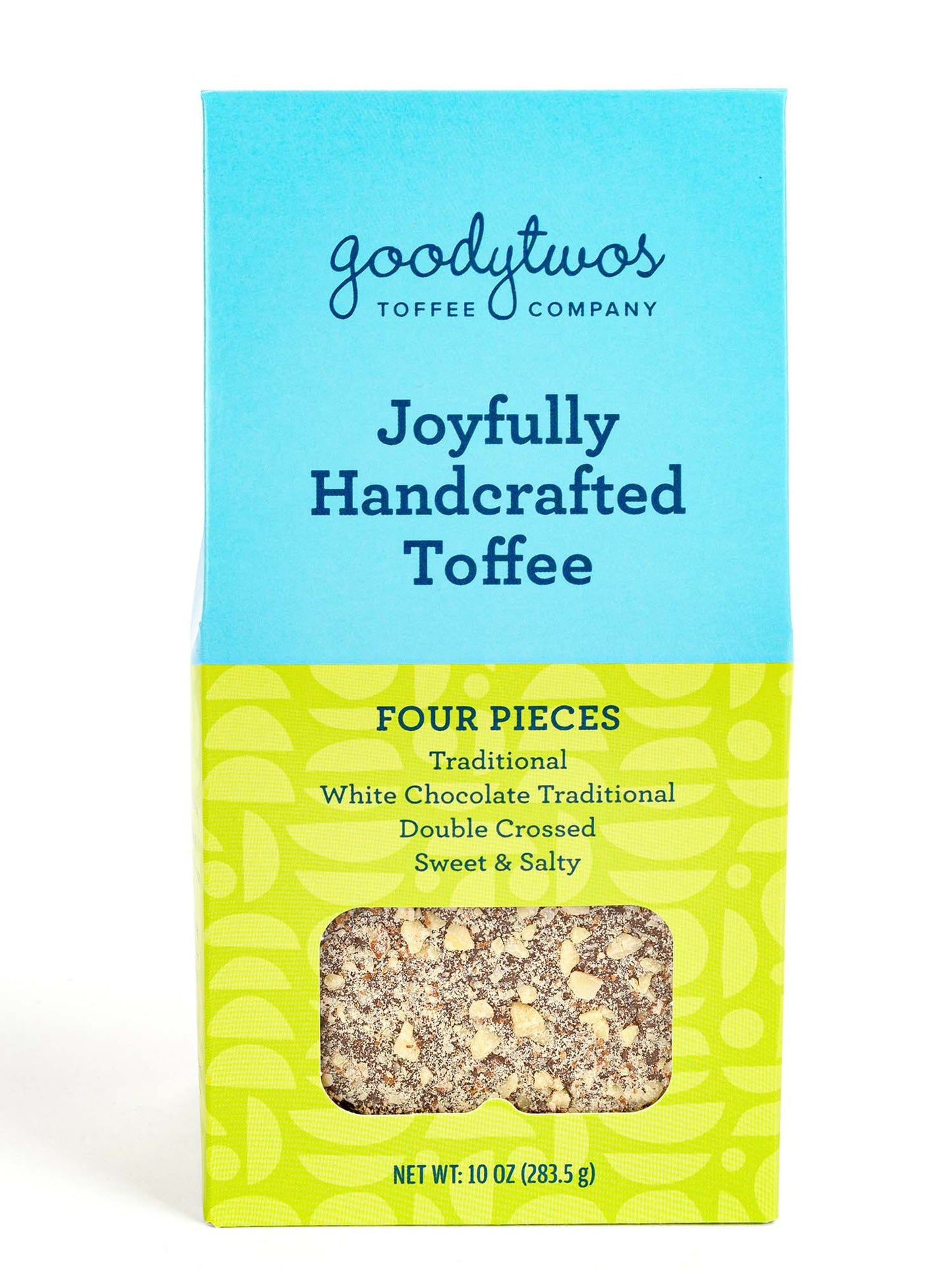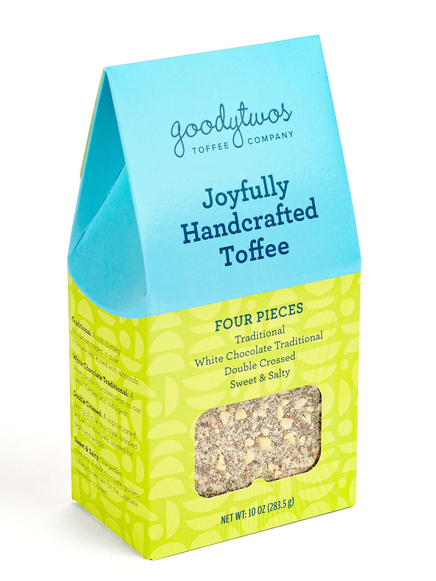 Your favorite obsession in a 'hideable size' bag. Snack 'em, gift 'em, or simply hide 'em for later. Who could blame you? Not us! Contains 4 individually wrapped toffee squares in the flavors Traditional, White Traditional, Double Crossed, and Sweet & Salty. (approx. 3"x3").